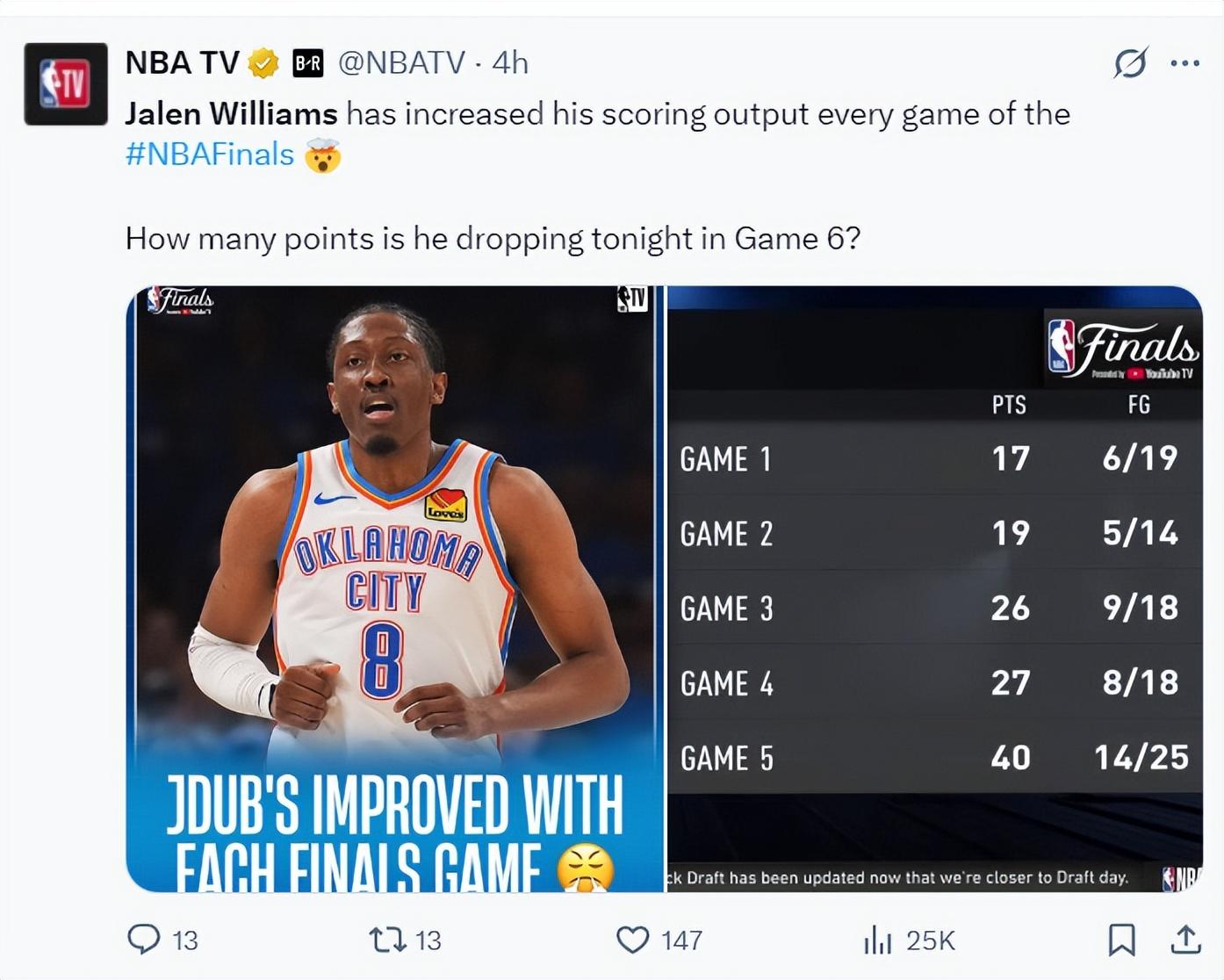 老八在總決賽系列賽每一場的得分都是提升17分、19分、26分、27分、40分,他天王山的表現是歷史等級的,這場G6球迷們在期待傑威繼續爆發。