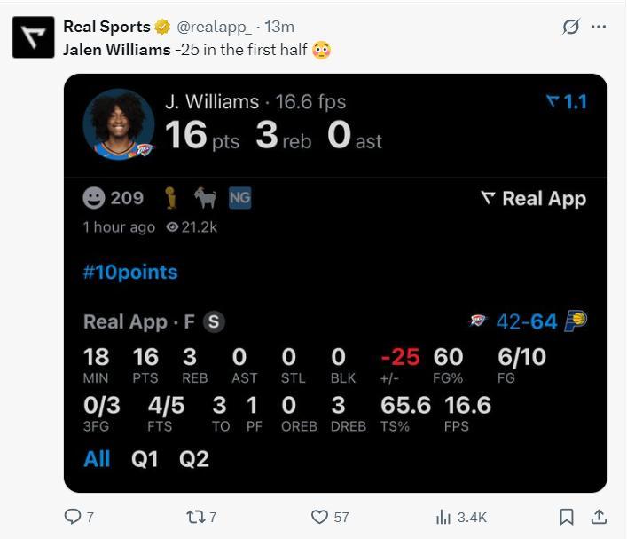 整個上半場雷霆之拿到42分出現了多達12次失誤,全隊只有3個助攻,可以說雷霆的進攻只能依靠傑威與SGA兩人,傑威半場18分鐘,10中6,罰球5中4拿到16分3籃板0助攻3失誤,可雷霆落後 到22分。