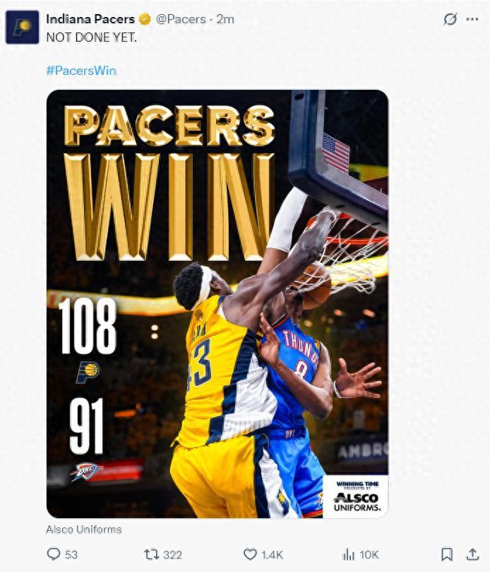末節,雷霆直接放棄比賽換全替補,卡萊爾讓哈利伯頓與內姆布哈德提前休息,三個主力也只打了4分鐘就被換下,兩隊全替補登場練兵時刻。