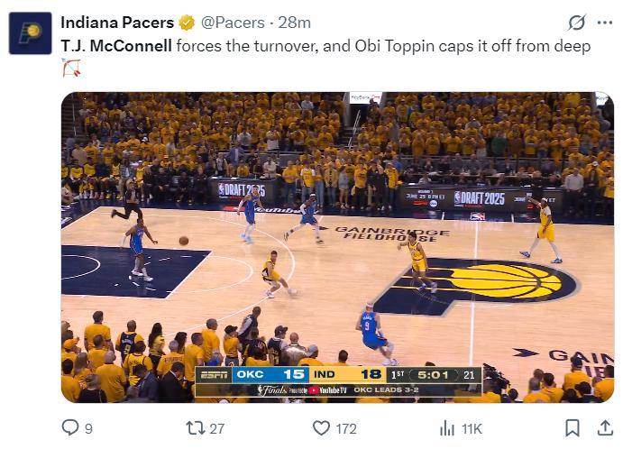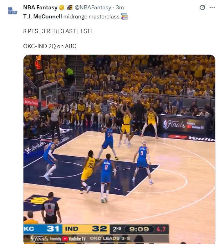 步行者第二節的一波17-9完全是依靠麥康打出來,他短短4分鐘5中4拿到8分3籃板1助攻1搶斷,之後他被哈利伯頓換下休息,全場球迷在他下場時不斷呼喊他的名字。