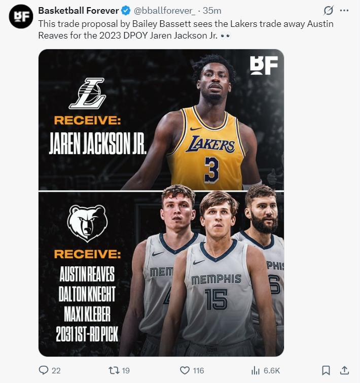 北京時間6月21日,NBA記者Bailey Bassett建議灰熊與湖人進行交易,雖然灰熊表態交易走貝恩後不願意送出莫蘭特與小賈倫,但Bailey Bassett認爲湖人如果願意送出奧斯汀-裏夫斯、道爾頓-克內克特、馬克斯-克勒貝爾、2031年首輪籤就可以打動灰熊隊,因爲小賈倫面臨續約,灰熊可以將這個“包袱”丟給湖人。