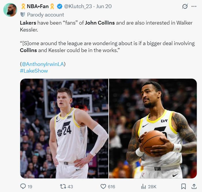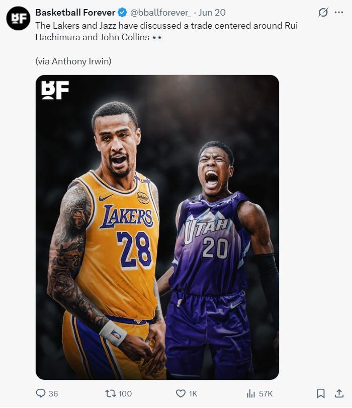 一天之前,湖人記者安東尼-勞瑞恩透露,湖人隊已經與爵士隊討論過關於八村壘換約翰-科林斯的交易,這筆交易如果達成,湖人的四號位有了尺寸的升級,科林斯是一位裸足2.08米足尺寸的PF,而八村壘是2.03米的四號位。