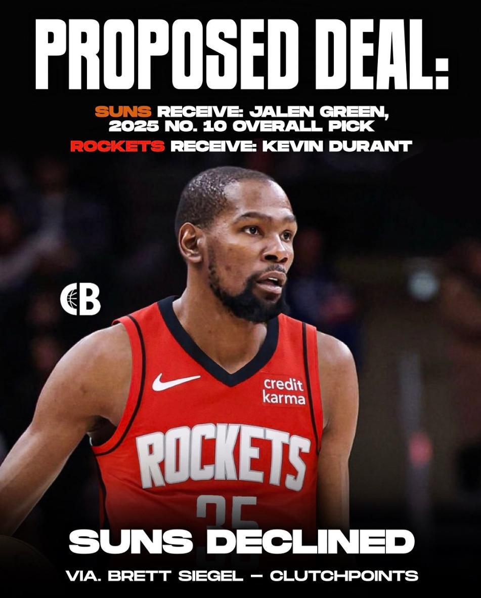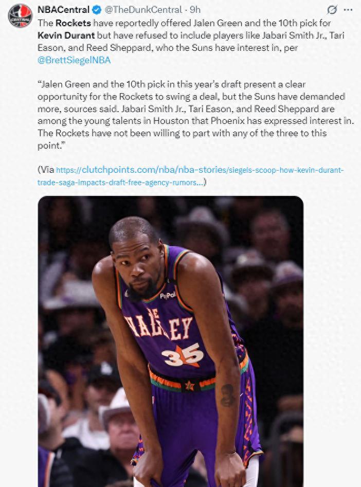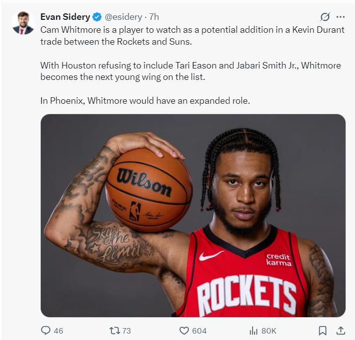 隨後《福布斯體育》記者埃文-斯迪瑞透露,太陽不太可能接受火箭隊的報價,除非他們在這筆交易中納入更多的交易資產比如小賈,如果太陽對KD的報價不滿意,交易不會貿然進行,他們已經準備將交易的時間延續到2025年選秀大會之後。