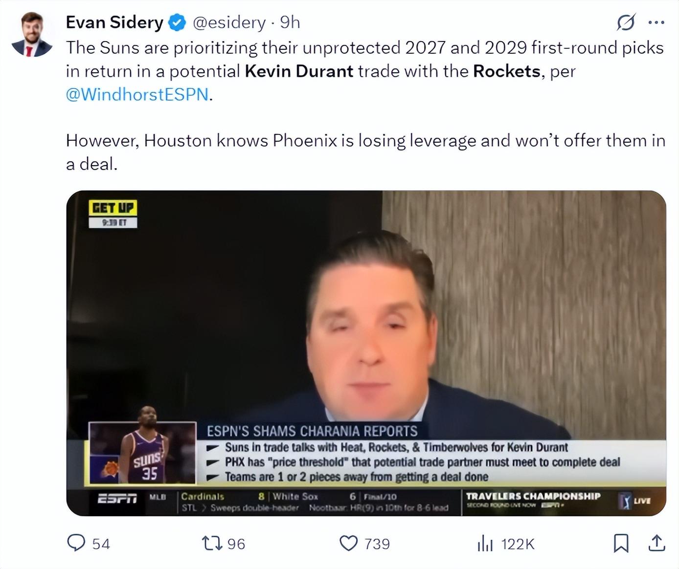 ESPN記者布萊恩-文霍斯特在播客節目中說道:在火箭/太陽關於凱文-杜蘭特的潛在交易中,太陽隊希望拿回他們2027年與2029年首輪選秀權(沒有一定要2025年10號籤),然而休斯頓清楚菲尼克斯在這方面訴求佔據主動,因此火箭管理層不會在交易中做出讓步。