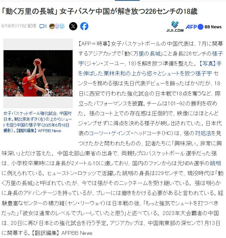 日媒BB News寫道:移動的萬里長城——中國女籃18歲2.26米的張子宇。文中還寫道:日本隊主教練科裏-蓋恩斯稱張子宇這名球員非常有趣,讓自己想到了當年在休斯頓火箭隊打球的姚明,這兩人都可以被稱之爲“移動的萬里長城”,張子宇的手感也跟姚明一樣柔和,他們並沒有因爲身高就僵硬的出手。