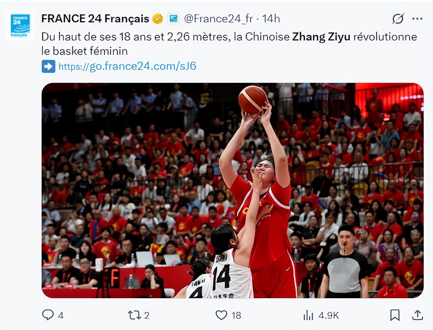 外媒France 24 Francais寫道:中國女籃18歲2.26米的張子宇正在改變世界女籃的歷史。