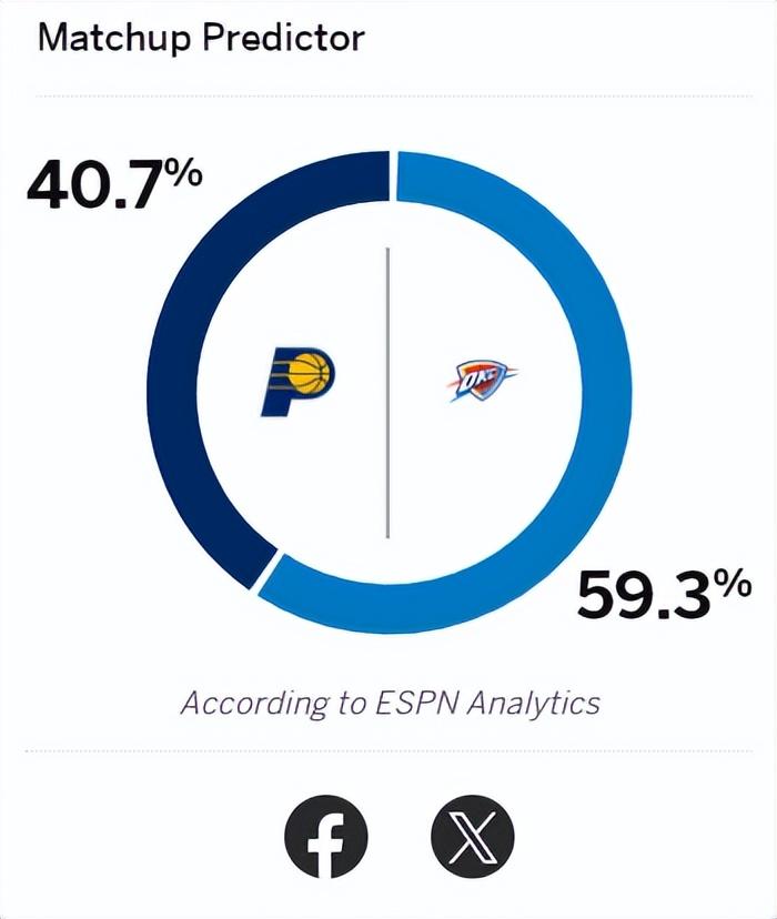 就連ESPN也給了雷霆搶七主場贏球概率59.3%,步行者只有40.7%,步行者如果能在俄城爆冷就會創造歷史。