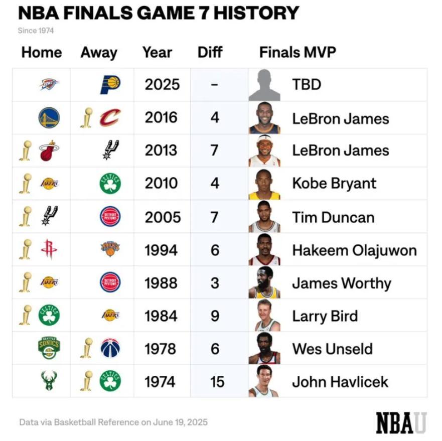 自1974年以來,總決賽3-3客隊贏球的只有三支,如果2025年的步行者成爲第四支就會創造51年紀錄,過去51年總決賽第四支客隊拿下總冠軍。