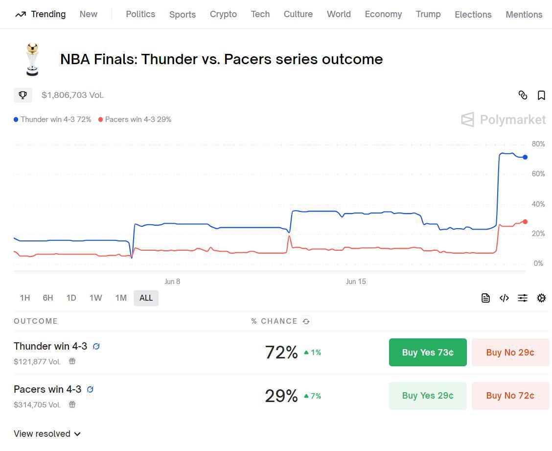 數據預測媒體Polymarket預測步行者4-3奪冠的概率只有29%。