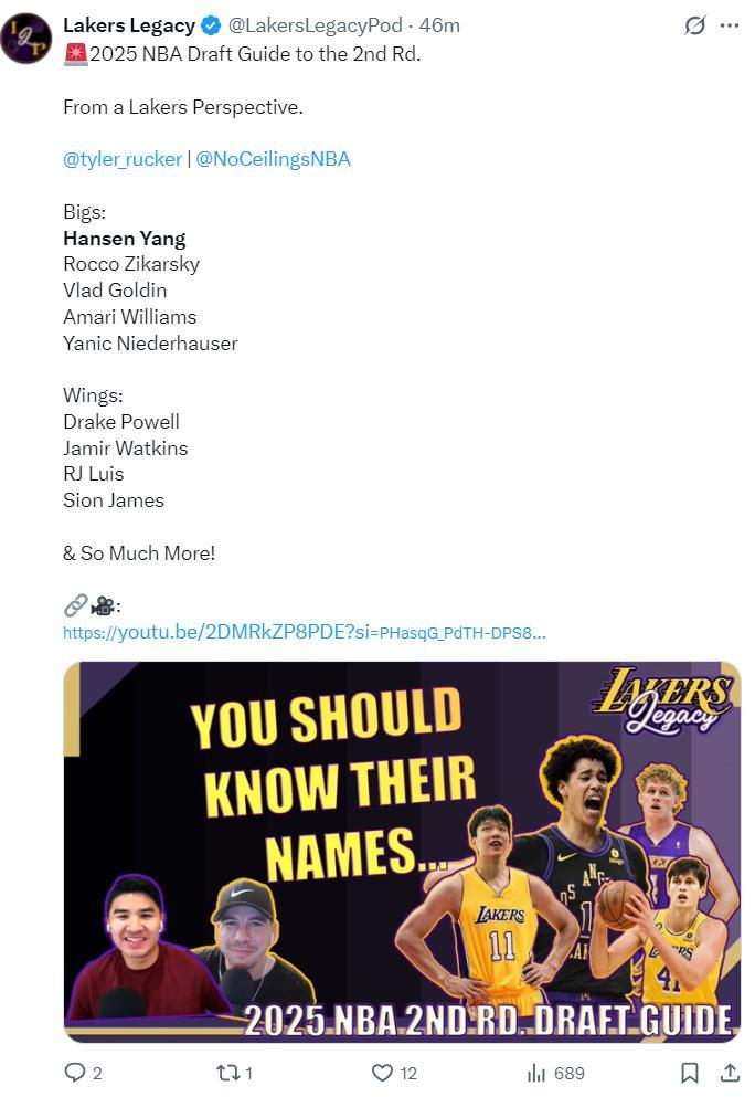 北京時間6月21日晚些時,湖人媒體Laker Legacy還在期待55號籤撿漏楊瀚森呢,因爲楊瀚森的經紀公司正好是Klutch Sports,裏奇保羅與湖人管理層交情匪淺。