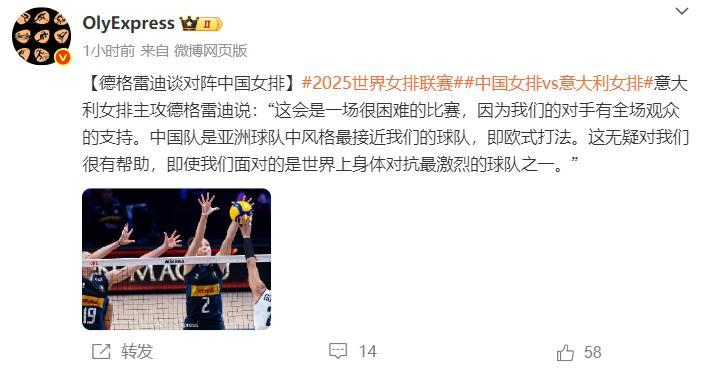 不過意大利助攻德格拉迪在接受採訪時談到即將面對的中國女排:“這會是最困難的比賽,因爲我們的對手除了中國隊以外還有全場觀衆。中國隊是亞洲球隊中風格跟我們最相近的,也就是歐式打法,我們即將面對世界上身體對抗最激烈的球隊之一,當然這對於我們來說也是有幫助的。”