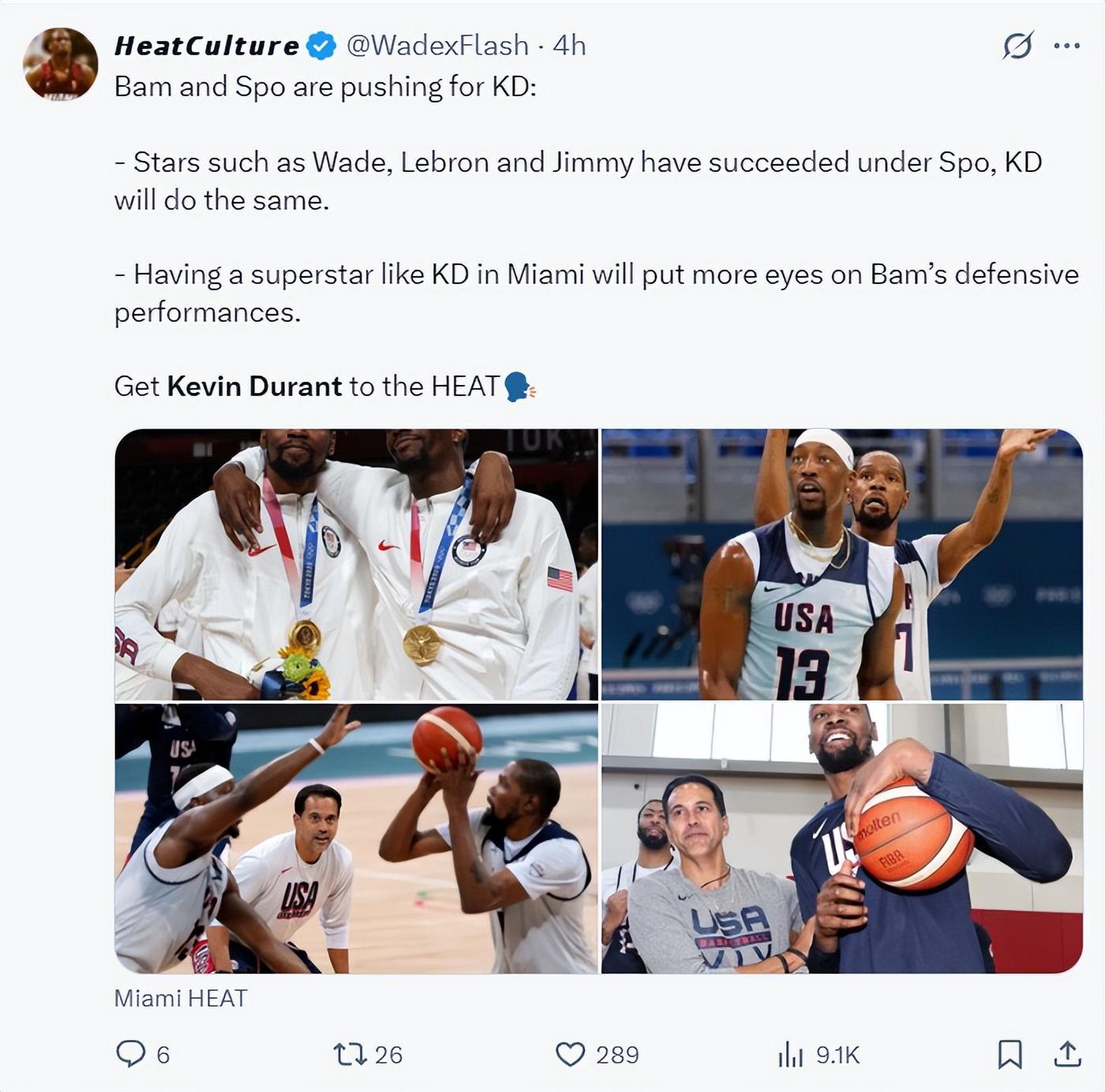 熱火媒體還聲稱阿德巴約與斯波爾斯特拉也會積極的幫助杜蘭特加盟,斯波執教過韋德、勒布朗、巴特勒這樣的巨星,他們在斯波手下都獲得了成功,杜蘭特到來後也會如此。