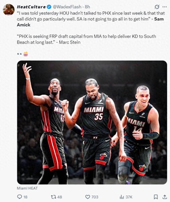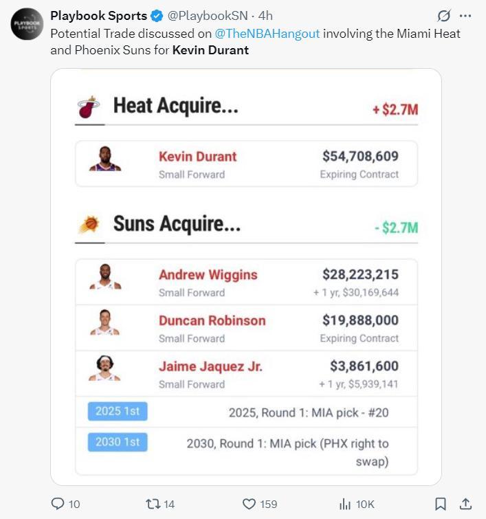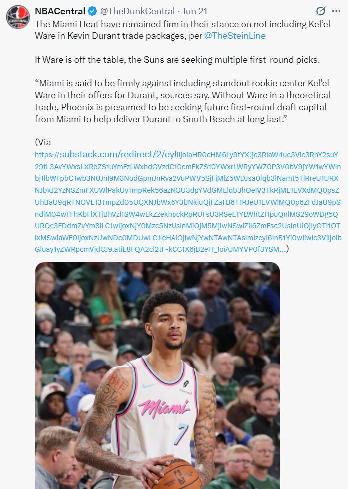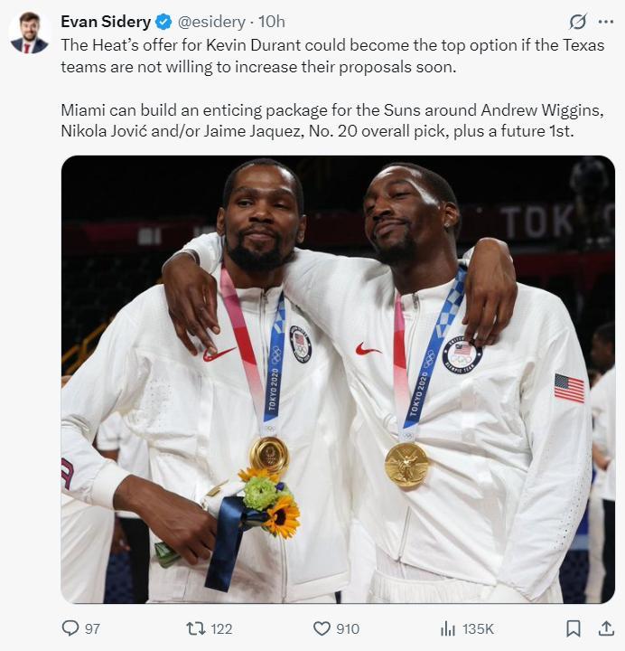 根據《福布斯體育》記者埃文-斯迪瑞的報道,如果得克薩斯州的球隊(馬刺、火箭)不肯提高報價,那麼杜蘭特會被太陽送到邁阿密。熱火對杜蘭特的報價將成爲最終的報價,邁阿密圍繞安德魯-威金斯、小海梅-哈克斯/尼古拉-約維奇、今年20號籤、未來一個選秀權作爲換杜蘭特的籌碼。