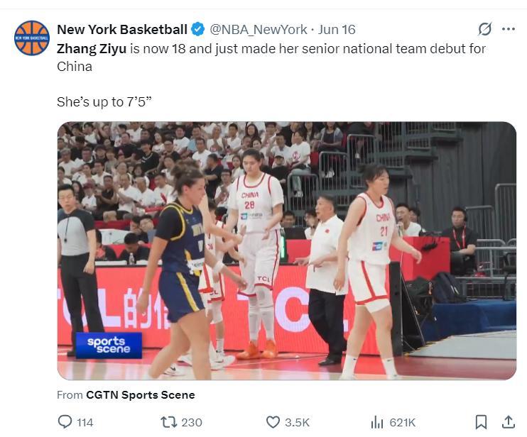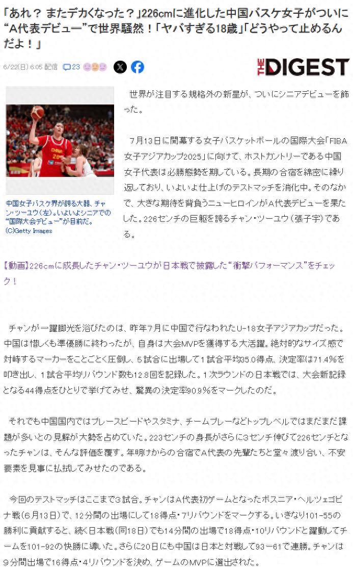 北京時間6月22日,日本媒體《The Gigest》撰寫長文盛讚中國女籃新星張子宇,標題是——啊,又長高了!進化到2.26米的中國女籃新星出道就在全球引起轟動,她才18歲怎麼阻擋啊?