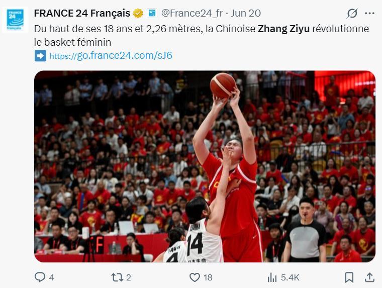 法國媒體的確一直都在關注張子宇的動態,還盛讚她將改變女籃歷史進程。