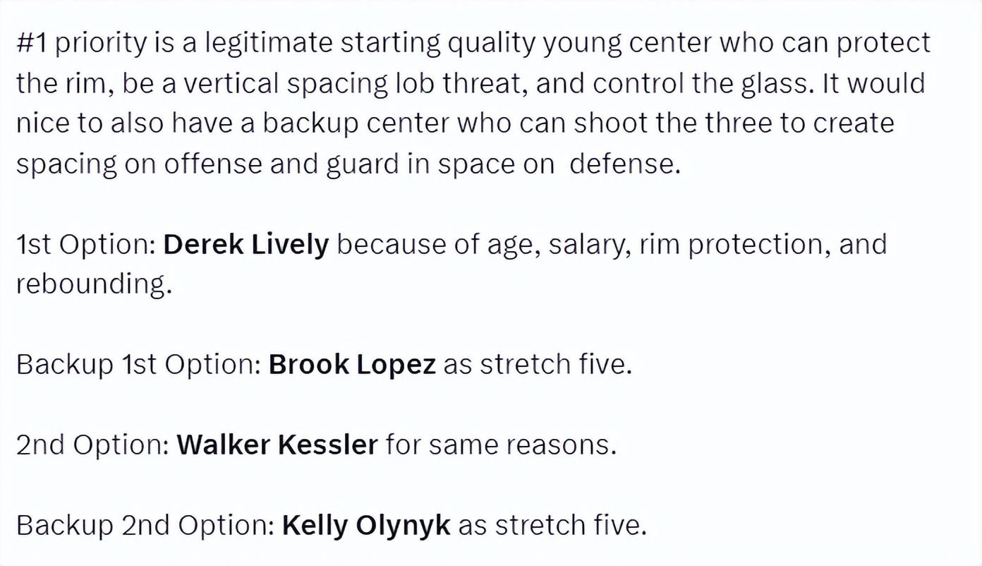 他認爲湖人最孱弱的是內線,湖人需要至少兩個中鋒,第一選擇是交易換來東契奇前隊友萊夫利,然後在自由市場上籤下布魯克-洛佩斯作爲替補;如果第一選擇失敗,那麼就從爵士隊交易來凱斯勒,在自由市場上籤下凱利-奧利尼克作爲替補。
