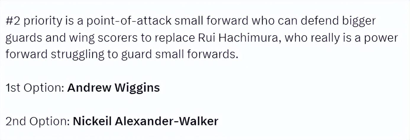 第二步是引援鋒線,因爲湖人欠缺籌碼,換鋒線只能依靠八村壘,所以第一選擇是熱火的安德魯-威金斯,如果威金斯沒有換來那麼就嘗試換來森林狼的亞歷山大-沃克,都是爲了提升球隊防守。