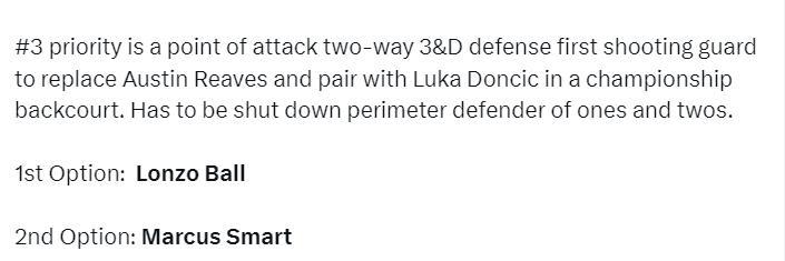 第三步就是提升後場防守能力,第一選擇是公牛隊的替補控衛朗佐-鮑爾,他曾在湖人搭檔過詹姆斯,他只要不受傷就是頂級防守球員;第二選擇是前DPOY斯瑪特,這兩人都是搭檔東契奇最好的後場防守選擇。