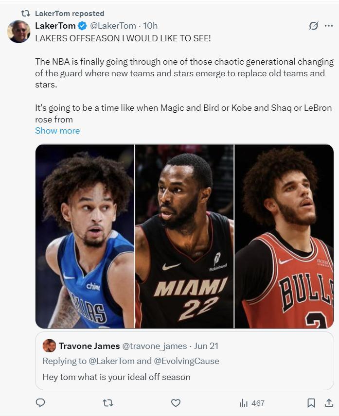 湖媒laker Tom希望新老闆沃爾特能在今夏幫助這支球隊重新打造一套爭冠陣容,畢竟沃爾特不差錢,讓這支球隊超過二奢線也無所謂,勒布朗巔峯末尾再拼一把。他爲61億大佬指明瞭方向,分三步走——1.中鋒、2.鋒線、3.後場。