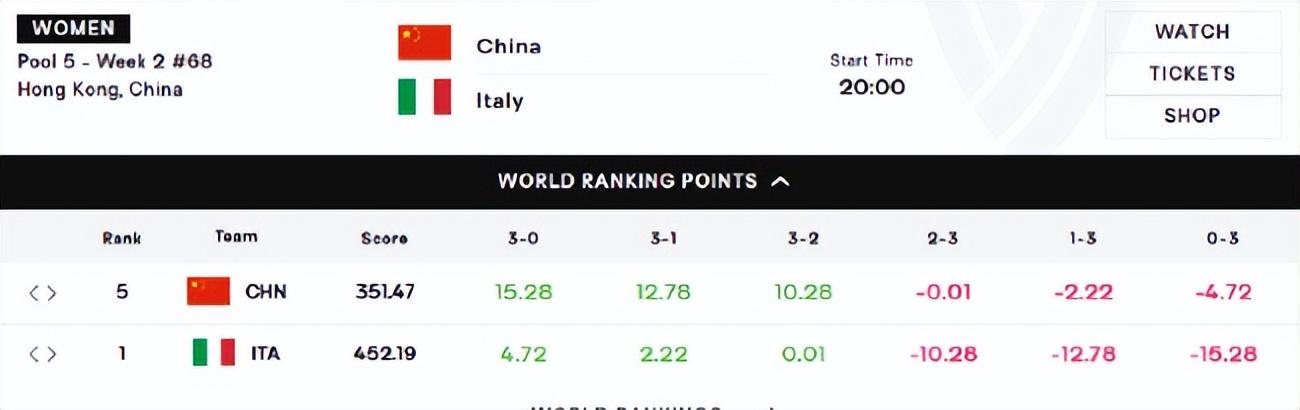 日本隊是343.59+3.49=347.08分,而中國女排是351.47分,日本女排距中國隊還差4.39分,所以中國VS意大利的比賽會決定日本女排能否重返世界前五,如果中國0-3意大利就會-4.27,屆時日本女排就會反超中國重返世界前五。
