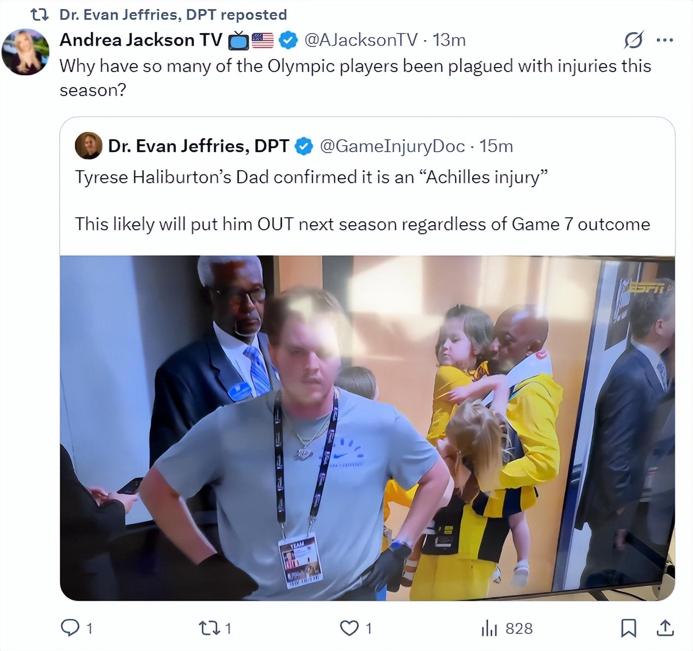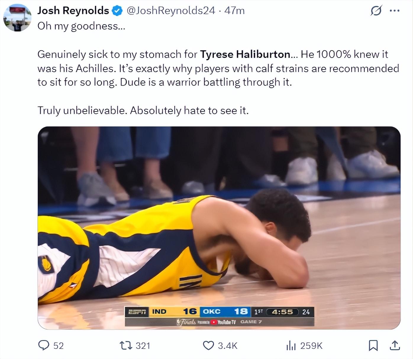 醫學專家埃文-傑弗里斯寫道:哈利伯頓的父親已經確認哈利遭遇跟腱傷勢,這可能導致他下個賽季都無法參賽。他還在視頻中詳細的分析了哈利伯頓的蹬地就是一個最常見的跟腱斷裂情況。