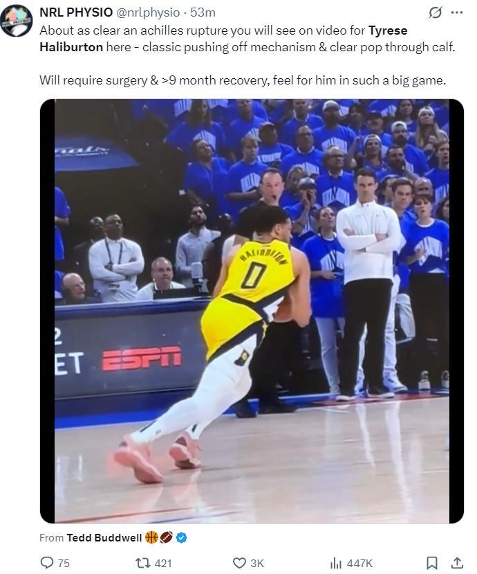 三位醫學專家都給了自己的判斷,NRL Physio寫道:從視頻的回放來看,哈利伯頓蹬地後你能看到最明顯的跟腱斷裂情況——典型的蹬地發力小腿處有爆裂聲。這需要進行手術治療,而且手術後康復期 長達9個月之久,這樣重要的比賽受傷很難,希望他能趕快好起來。