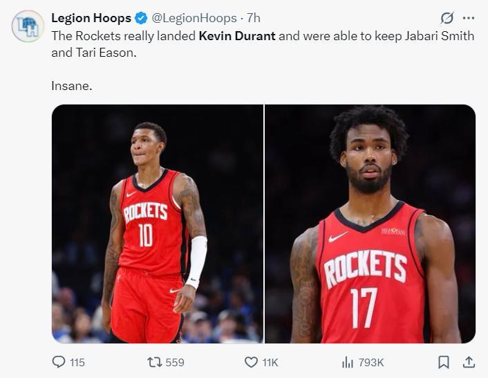 美媒LH寫道:火箭隊真的交易來了杜蘭特還留住了小賈巴里-史密斯與塔裏-伊森這太瘋狂了。