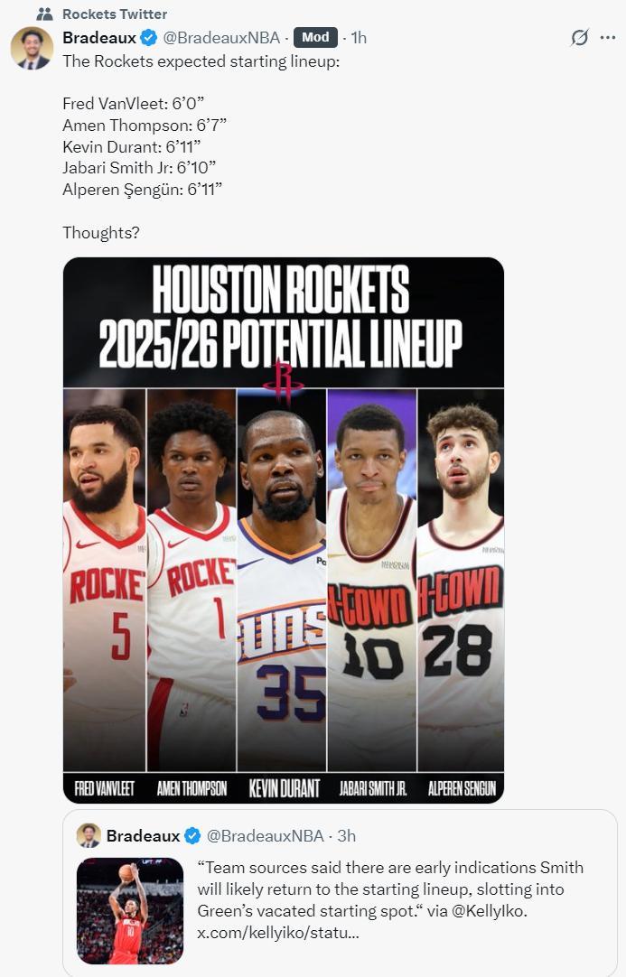 休媒曬出火箭新賽季的先發五虎:範弗利特6尺、阿門6尺7、杜蘭特6尺11、小賈6尺10、申京6尺11。