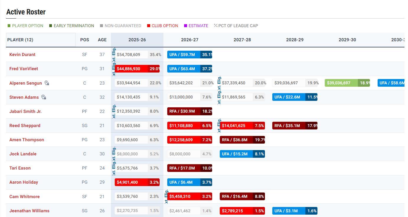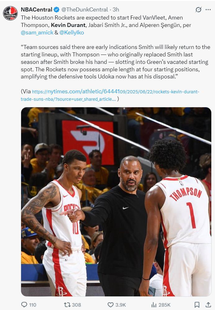 杜蘭特加盟後火箭是全新的12人大名單:杜蘭特、範弗利特、申京、亞當斯、小賈巴里、謝潑德、阿門、蘭代爾、伊森、霍勒迪、惠特莫爾、吉威。
