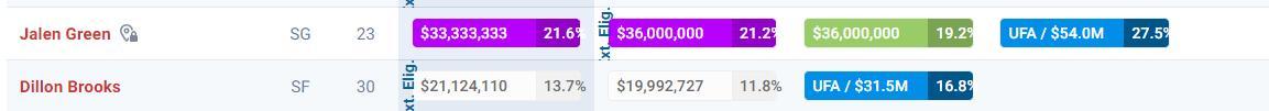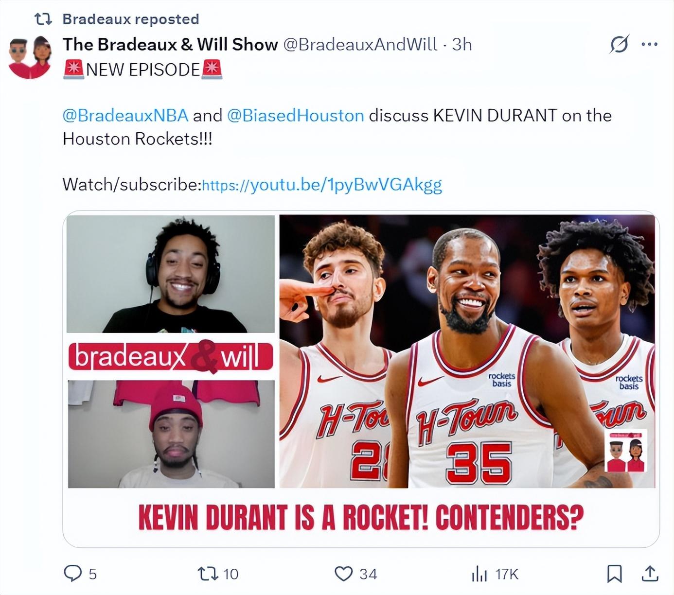 休媒Bradeaux與Will在交易後開啓了直播,兩人都在直播間高呼這筆交易火箭贏麻了,首先杰倫-格林在季後賽發揮不佳,他未來三年1.05億的合同今夏就要生效,而狄龍還剩兩年的合同,火箭換來的是一年合約的杜蘭特,如果KD在火箭打的不盡如人意明夏火箭就可以放棄他清理超過5千萬的薪金空間。