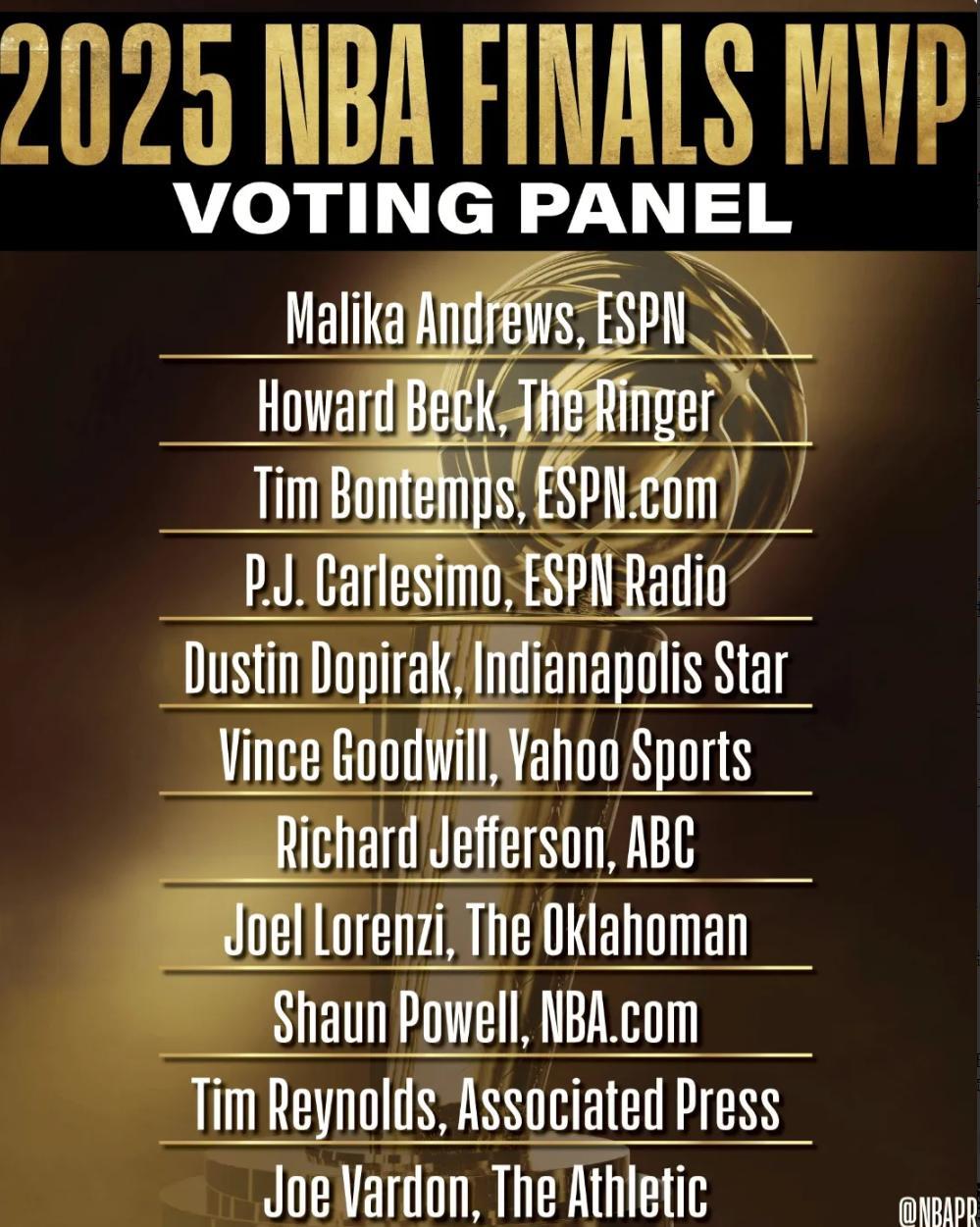 最終亞歷山大也是11票全票當選FMVP,沒辦法,因爲SGA在兩隊裏的數據太突出了,沒有一人可以跟他接近,除非是步行者奪冠不然肯定是SGA的FMVP。