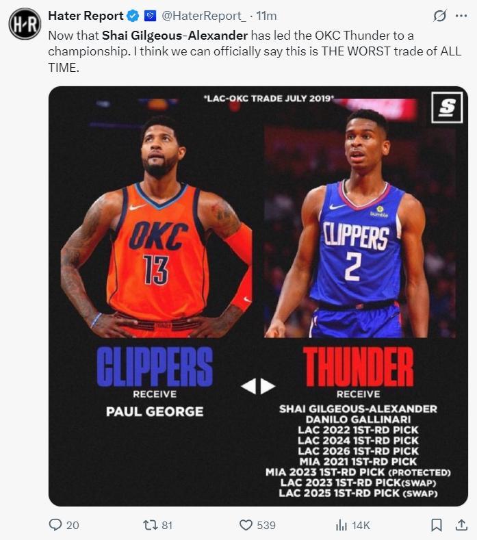美媒HR再度上傳了快船當年用9換1喬治的交易方案寫道:這是NBA歷史上最糟糕的交易。