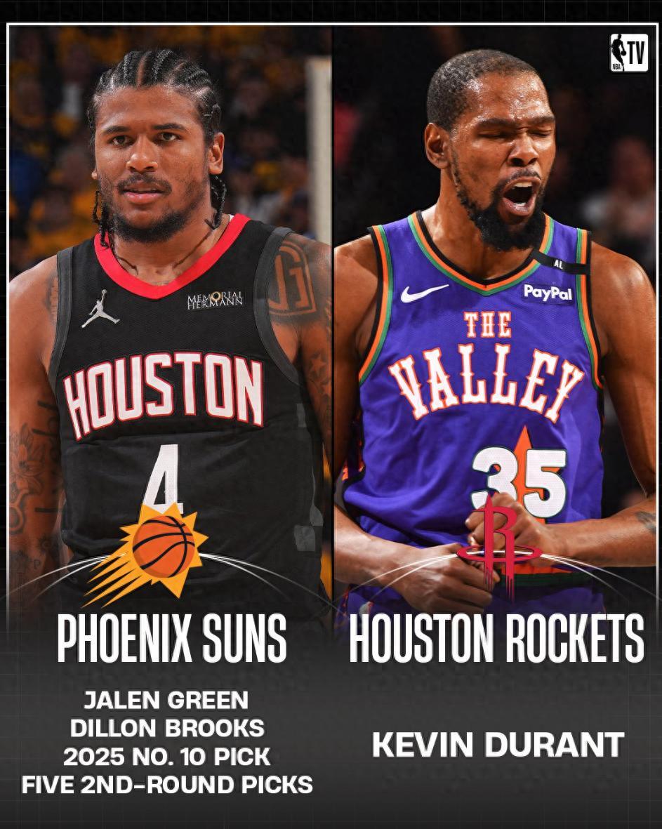 太陽與火箭達成交易,火箭送出杰倫-格林、狄龍-布魯克斯、2025年10號籤、未來5個次輪籤換到了凱文-杜蘭特,這筆交易火箭擺脫了三年合同的格林與兩年合同的狄龍換來了一年合同的杜蘭特。