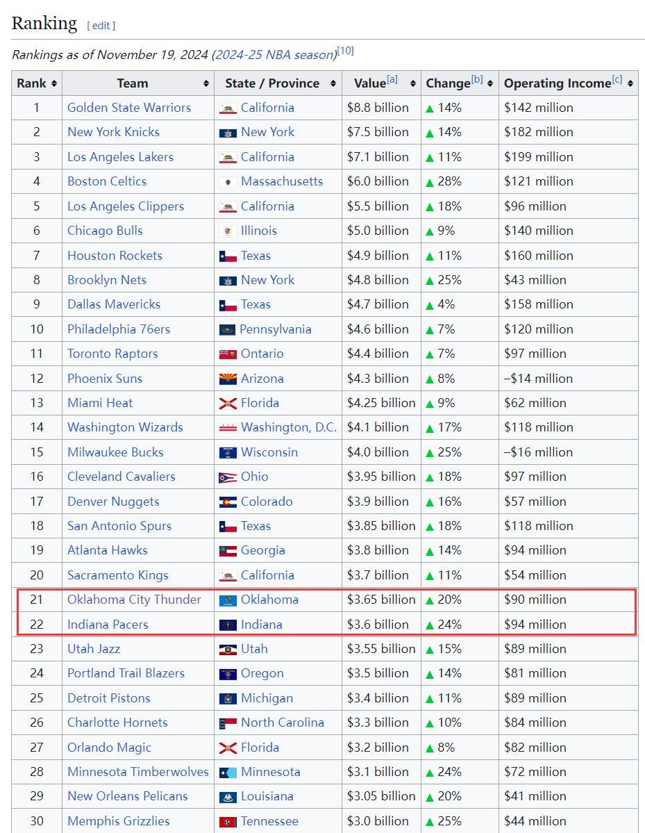 從球隊市值排名榜來看,雷霆36.5億排在聯盟第21,步行者36億排在聯盟第22,這兩支球隊是絕對意義上的小球市。