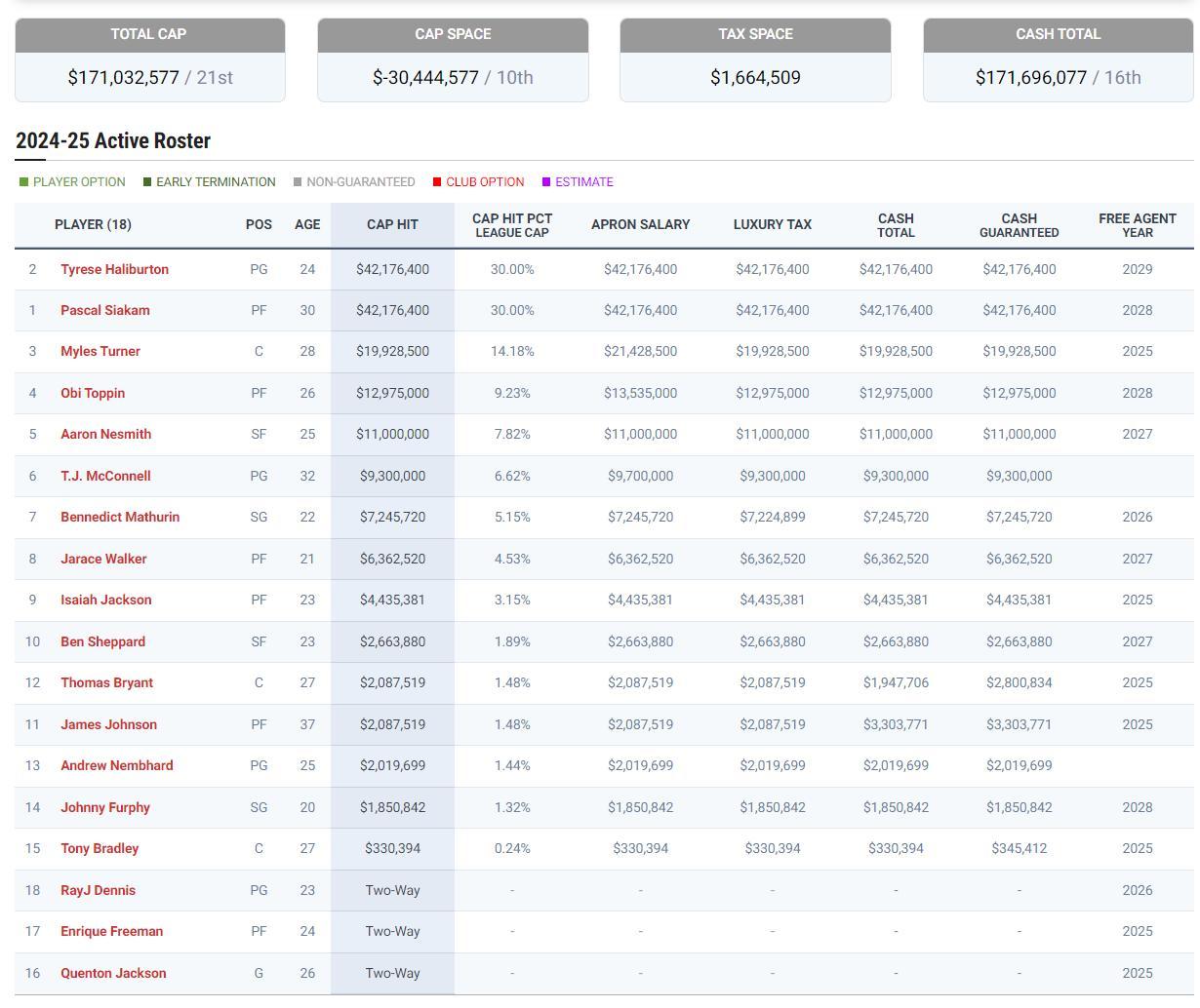 雷霆的總決賽對手步行者24-25賽季薪資總計1.71億排在聯盟第21位,換言之這兩支球隊都是支出有限的“寒門”。