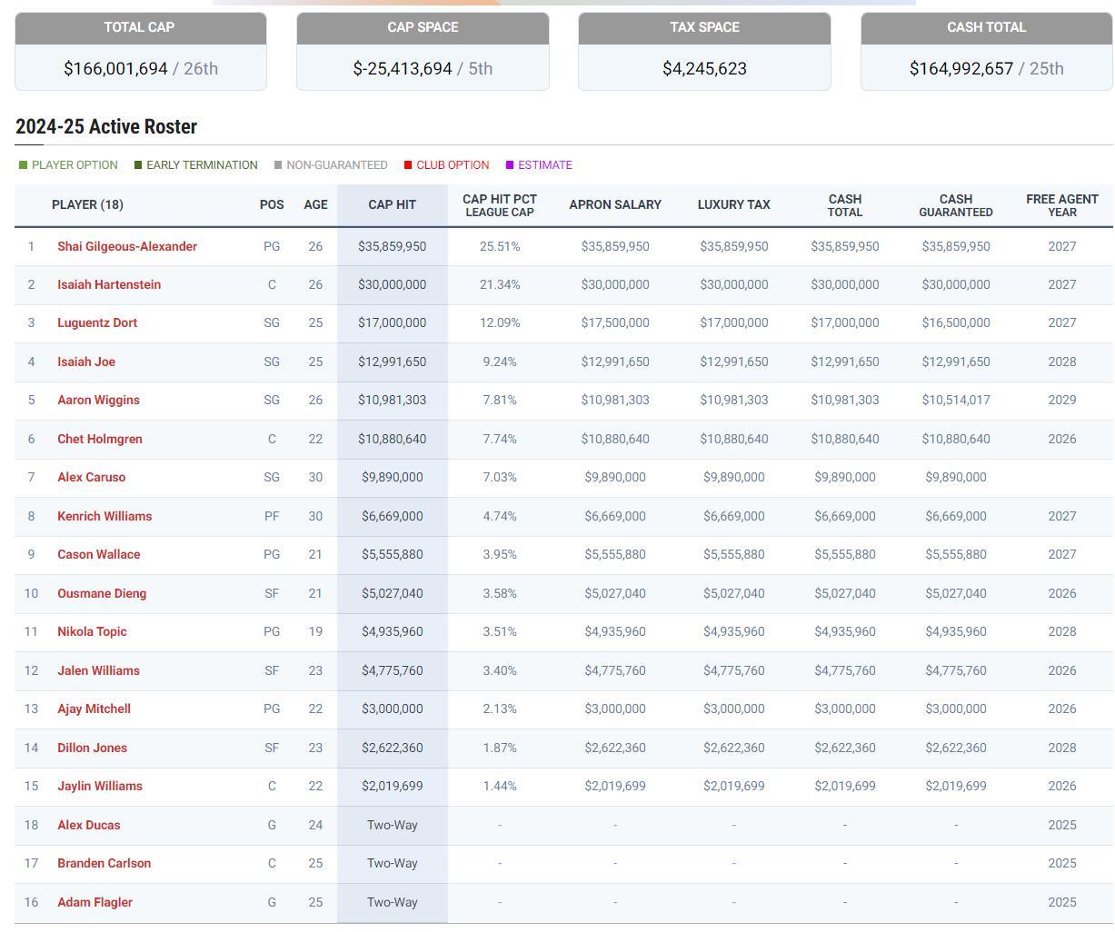 雷霆24-25賽季這15+3名單合計薪資爲1.66億排在聯盟第26位,你們沒有看錯,雷霆的總薪資僅排聯盟第26但他們拿到了總冠軍,這就是小球市的逆襲。