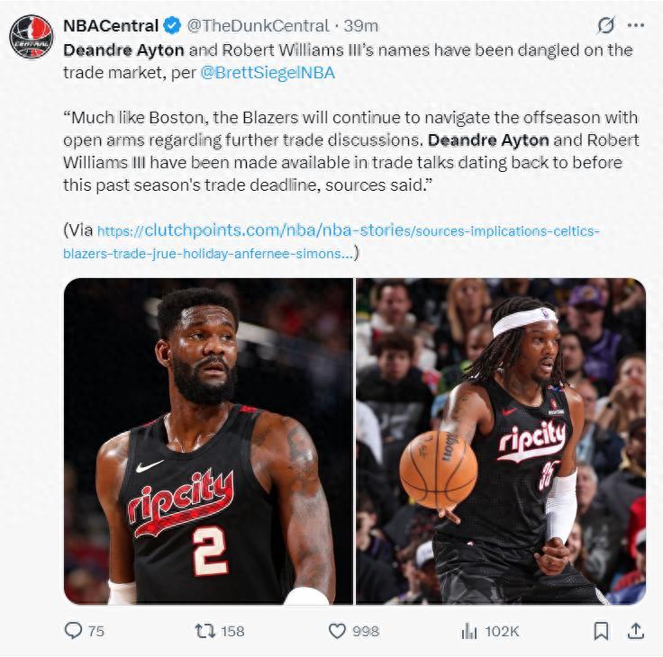 北京時間6月24日晚,NBA記者Brett Siegel透露,開拓者休賽期將繼續在交易市場上保持活躍,他們一直在積極進行交易談判,開拓者正在努力將德安德烈-艾頓與羅伯特-威廉姆斯送走。