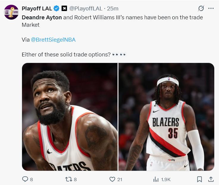 湖人媒體Playoff LAL立馬轉發了這則消息:艾頓與羅威已經被開拓者擺上貨架,這兩人選擇那種更合適的交易選擇呢?