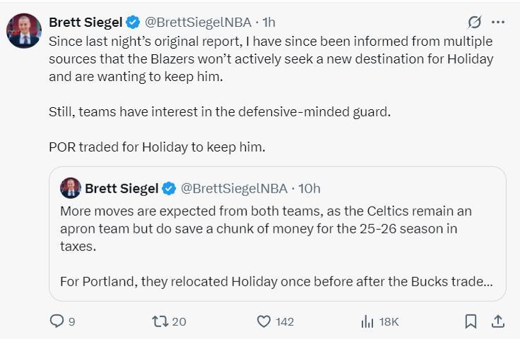 除此之外,開拓者管理層是希望留住35歲老將後衛朱-霍勒迪的,但目前有多支球隊在與開拓者溝通,如果價碼合適開拓者會再度交易掉這位身背三年1.04億鉅額合同的老將後衛。