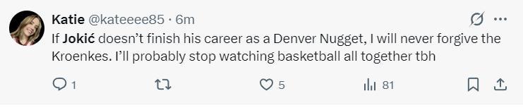 掘金球迷:如果約基奇不在丹佛掘金結束他的職業生涯,我永遠都不會原諒克倫克家族。說實話,那樣的話我可能就不看NBA了。