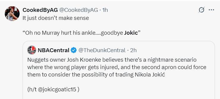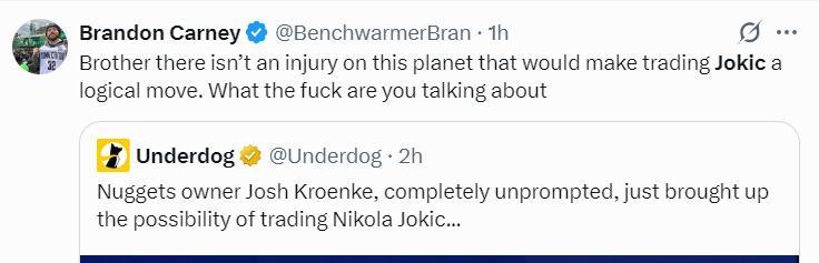 掘金記者:兄弟,這個星球上沒有任何一種傷病會讓人覺得交易約基奇是明智之舉,克倫克你到底在說什麼?這根本說不通啊。