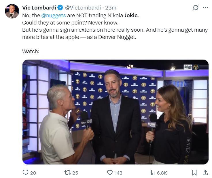 掘金記者Vic Lombardi在發佈會現場再一次詢問克倫克你們真的想要交易約基奇嗎?克倫克說:不,掘金沒有打算交易約基奇,他很快會跟球隊談續約,作爲掘金的一員,他今後會繼續出現在比賽場上。(換言之不出現極端情況掘金不會交易約基奇,但輿論已經擋不住了)