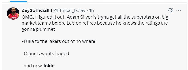 美球迷:天啊,我終於明白了,亞當-肖華想在勒布朗退役之前把所有球星都安排到大球市區,因爲他清楚勒布朗退役後收視率肯定會大跌。現在東契奇去了湖人,揚尼斯正在探索被交易,而現在是尼古拉-約基奇了。