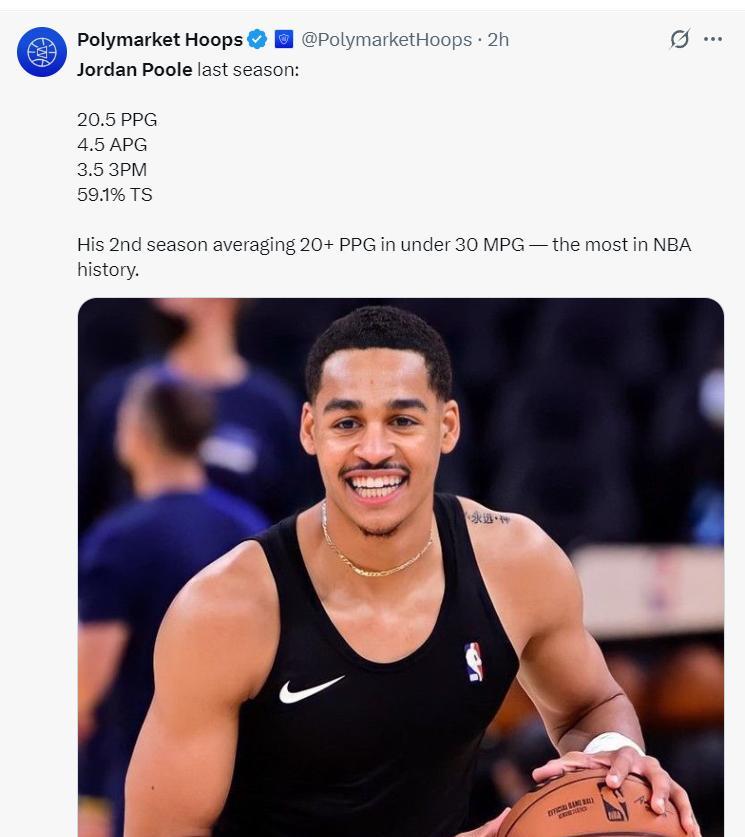 普爾上賽季場均29.4分鐘就能拿到20.5分4.5助攻3.5三分,真實命中率59.1%,這是他生涯第二個場均20+的賽季且場均登場時間不足30分鐘,這是歷史最高效的場均20+賽季。