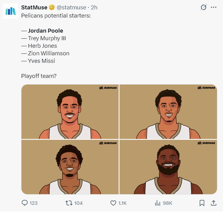新賽季鵜鶘潛在的先發五虎:普爾、墨菲、赫伯特瓊斯、錫安、米西,薩迪克-貝打替補,只要鵜鶘能保持健康他們新賽季會有很強的競爭力。