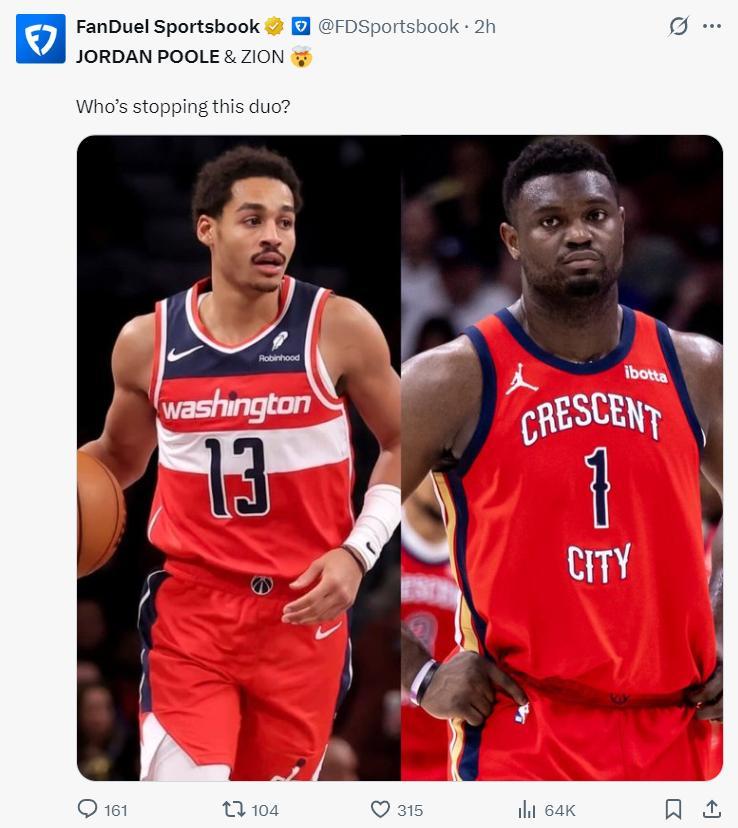 美媒FanDuel寫道:喬丹-普爾聯手錫安-威廉森,誰還能阻擋這對組合?