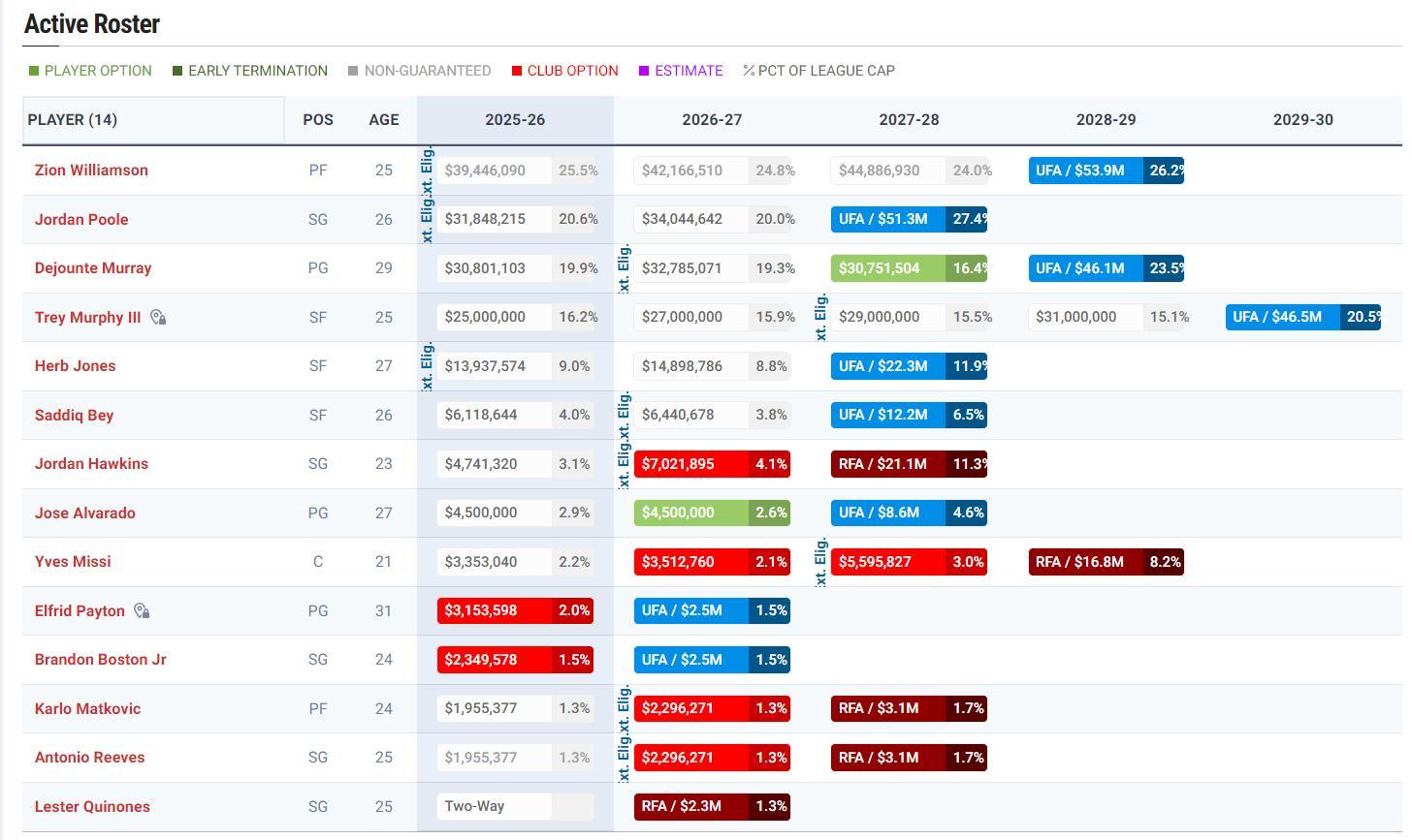 鵜鶘全新的13人名單:錫安、普爾、德章泰-穆雷(跟腱撕裂下賽季大概率無法打)、墨菲、赫伯特-瓊斯、薩迪克-貝、霍金斯、阿爾瓦拉多、米西、艾弗裏-佩恩、小波士頓、瑪特科維奇、安東尼奧-裏夫斯。這套13人名單硬實力上升不少,如果不是穆雷跟腱大傷,說不定鵜鶘新賽季會成爲黑馬。