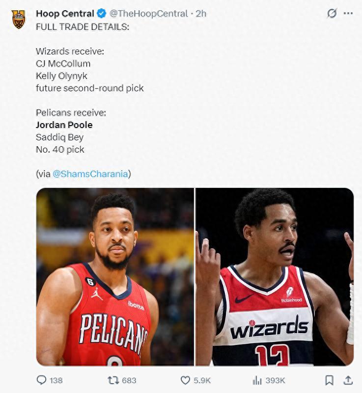 北京時間6月25日,鵜鶘與奇才達成一筆交易,鵜鶘將CJ-麥科勒姆、凱利-奧利尼克和一個未來的次輪籤送到奇才,得到喬丹-普爾、薩迪克-貝和40號籤。