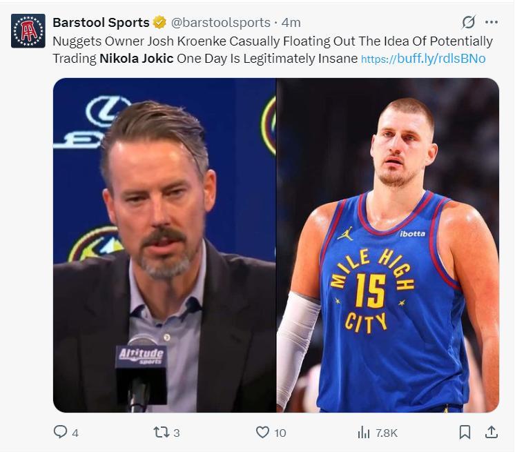 北京時間6月25日,掘金總裁克倫克接受了專訪,他在採訪中提到——特定的條件下會交易掉尼古拉-約基奇(15號)。