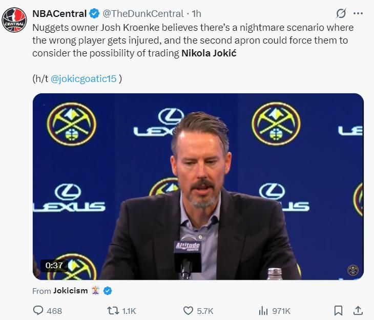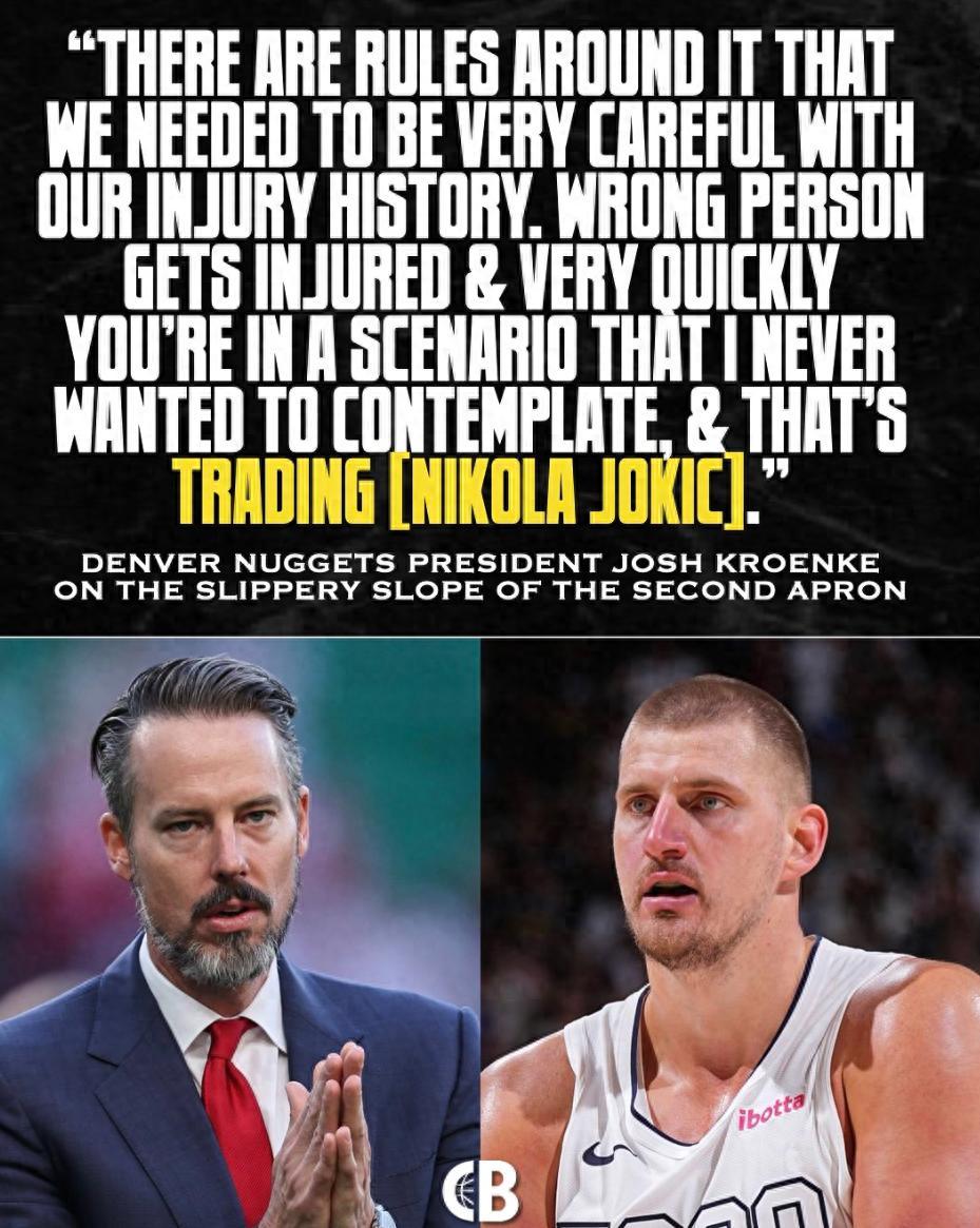 克倫克的原話是:“我們並一定害怕觸碰第二土豪線,但圍繞它的確存在一些規則,我們必須非常小心,尤其是考慮到我們的傷病歷史。如果錯誤的人受傷,我們很快會陷入一種難以想象的局面——那就是不得不交易掉尼古拉-約基奇。”